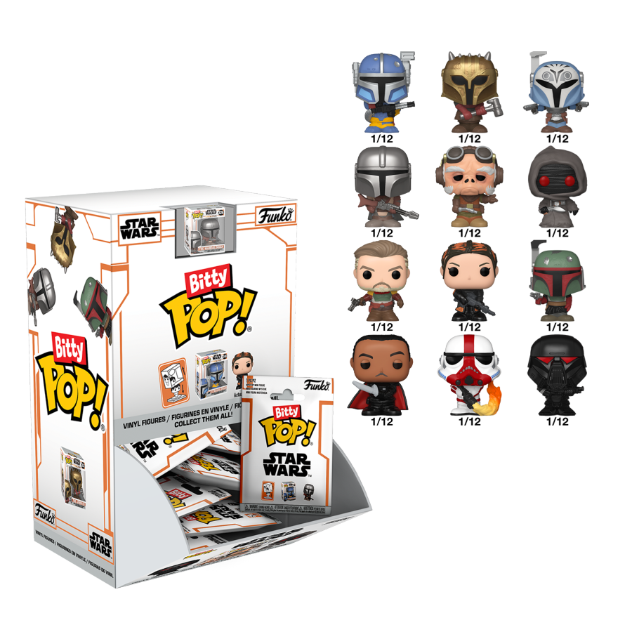 Theres Bitty Pop! Heavy Infantry Mandalorian, Bitty Pop! The Armorer, Bitty Pop! Bo-Katan Kryze, Bitty Pop! The Mandalorian, Bitty Pop! Kuiil, Bitty Pop! Offworld Jawa, Bitty Pop! Cobb Vanth, Bitty Pop! Fennec Shand, Bitty Pop! Boba Fett, Bitty Pop! Moff Gideon, Bitty Pop! Incinerator Stormtrooper, and Bitty Pop! Dark Trooper.