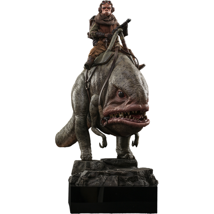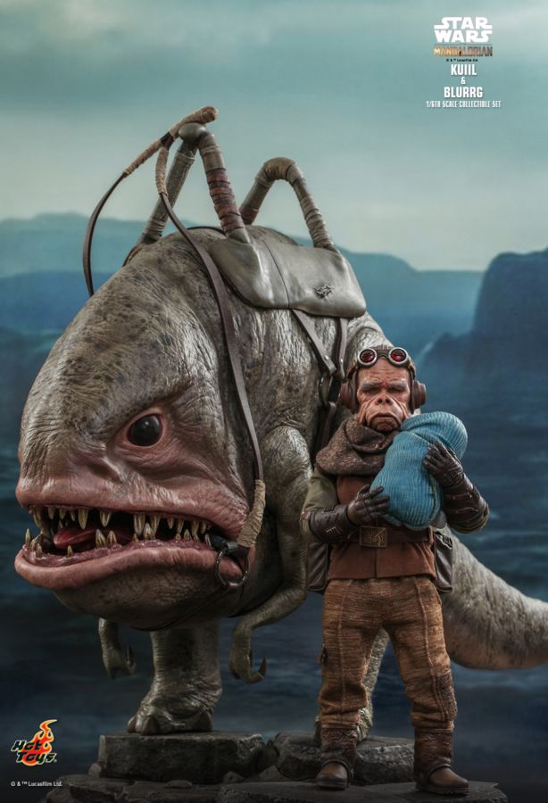 "The blurrgs will join me as well. I have spoken." Kuiil the Ugnaught is a widely beloved character in the highly acclaimed The Mandalorian live-action series. Originally came to seek peace in an out-of-the-way world on Arvala-7, Kuiil helped the Mandalorian in many ways by teaching him to ride a blurrg, repairing the Razor Crest, and protecting young Grogu with his life. Sideshow and Hot Toys present the Kuiil & Blurgg Sixth Scale Figure Set from The Mandalorian! The Kuiil collectible figure features a newly developed head sculpt with stunning likeness, an outfit with highly detailed tailoring, a rifle with a tranquilizer dart, a pair of goggles, a backpack, a bucket, and a themed display base! The highly accurate Blurrg stands at approximately 37cm tall (43cm with base) and 60cm in length. It features a detailed head and body, articulated arms, a saddle, and a rocky theme display stand! View all