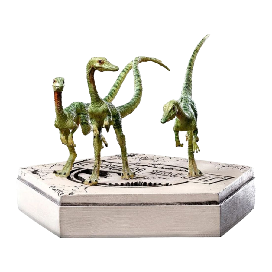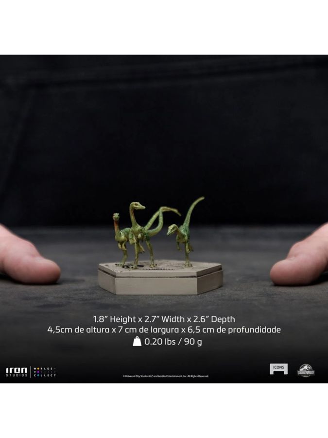 This product is expected to ship: Jul 2023 - Sept 2023 One of the smallest dinosaurs ever found the Compsognathus lived in the Europe region at the end of the Jurassic period. Introduced in "Jurassic Park 2: Lost World", where a pack attacked the girl Cathy Bowman that was feeding one of the small dinosaurs, happily she survived the attack. Later another pack attacked the hunter Dieter Stark when he got lost in the forest of Isla Sorna, and unfortunately, the hunter didn ’t survive. It was revealed in “Jurassic World: Fallen Kingdom ” that a population of Compsognathus survived Isla Nublar, and in “Jurassic World: Dominion ”, the Department of Prehistoric Wildlife confirmed a sighting of Compsognathus in Brazil eating garbage, besides their presence in the U.S. and Europe. Iron Studios proudly present their new statue "Compsognathus Jurassic World - Icons". Based on the eponymous novel by Michael Crichton, the awarded filmmaker Steven Spielberg, and Universal Studios astonished the audiences worldwide in 1993 with the premiere of Jurassic Park in the movie theaters. Huge fans of the franchise, maintaining a successful partnership that started in 2017, Iron Studios present their new collection "Jurassic Park-Icons", with miniature statues over stylized pedestals with their logo, that meticulously bring the same realistic details on its anatomy and painting as seen in their larger-scale statues. Besides creating an opportunity for fans and collectors to expand their collection with new replicas of their most beloved Dinosaurs, this new line will bring new collectors, introducing an accessible cost-benefit format, both in price and size, impressing with its richness in detail and standard of excellence and quality that are trademarks of Iron Studios. For the first time attending with their own booth at SDCC 2022, Iron Studios introduced a preview with the prototypes of "Jurassic Park-Icons", with the statues of T-Rex, Velociraptors, and Brachiosaurus, and on the monthly show Inside Iron Studios Day on YouTube, presented the future releases of the line in more detail, making available for Pre-Order the statues T-Rex, Compsognathus and Velociraptor Blue inspired by Jurassic World. Soon many other dinosaurs from Jurassic Park and Jurassic World will come to expand this collection, which has already been approved by fans and collectors that are eagerly waiting for it. View all