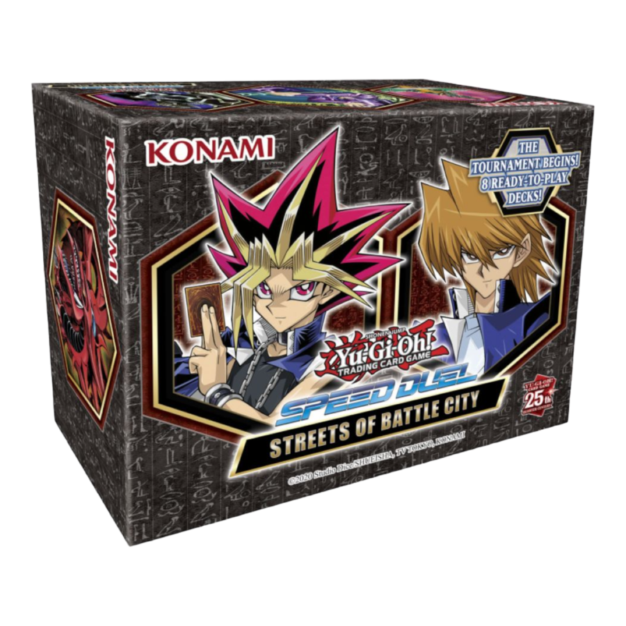 Attention Duelists! The Battle City Tournament is underway! In the Yu-Gi-Oh! TRADING CARD GAME (TCG) Speed Duel: Streets of Battle City box, you and your friends can take on the roles of Yugi Muto and Joey Wheeler as they Duel their way to the Battle City quarterfinals. But don't expect it to be easy - many other Duelists have the same goal! Mako Tsunami, Weevil Underwood, and Espa Roba are all vying for a spot as well, and the mysterious Marik has sent Seeker the Rare Hunter, Arkana the Magician, and Strings the Quiet One to stop you! Speed Duel: Streets of Battle City comes with 8 Pre-Constructed Decks ready-to-play right out of the box! You can relive classic moments from the show with brand-new Skill Cards that will make you feel as if you are right in the action Dueling on the streets of Battle City! Speed Duel: Streets of Battle City is full of cards that are brand new to Speed Duel, and if you missed out on the original Speed Duel: Battle City Box, you'll have another chance to get your hands on some of the powerful cards that were introduced there! Each Speed Duel: Streets of Battle City box also comes with 8 Secret Rares that could include iconic cards like Yugi's Dark Magician Girl and Joey's Flame Swordsman! Do you and your friends have what it takes to rise to the top and survive the streets of Battle City?! Each Speed Duel: Streets of Battle City box contains a grand total of 228 cards, all usable in Speed Duel: 200 Commons 20 Skill Cards 8 (of 24) Secret Rares 2 of the 8 Secret Rares in every box will be Slifer the Sky Dragon and Arkana's Dark Magician. 4 Deluxe 2-Player Game Mats featuring Yami Yugi and Arkana To use a card in Speed Duel it must have the Speed Duel symbol on the card. Cards without the symbol are not legal, but Speed Duel cards can be used in the Yu-Gi-Oh! TCG. Skill Cards may only be used in Speed Duel.