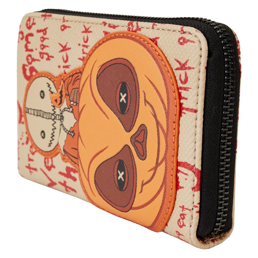 The loungefly Trick 'r Treat Pumpkin Cosplay Zip-Around Wallet is ready for some fun. On the front of this wallet, Sam pops up over a bright orange, devilish-looking pumpkin, and he's holding a half-eaten jack-o'-lantern lollipop. Behind him, "dripping" red letters spell out, "Trick or treat. Give me something good to eat" in a motif that carries over to the reverse side.