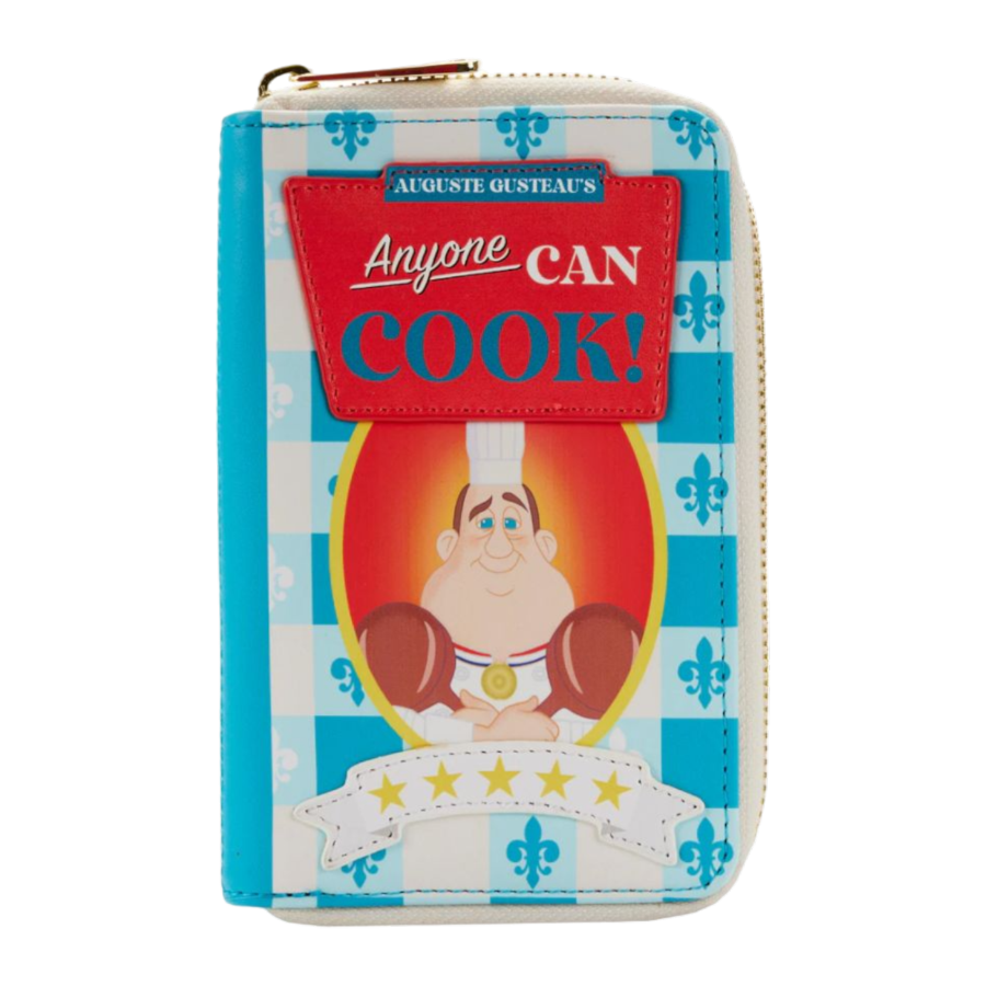 Cook up something fun with your very own celebrity chef cookbook as this Loungefly Disney-Pixar Ratatouille 15th Anniversary Gusteau's Cookbook Zip Around Wallet. The entire zip-around wallet is a delightful recreation of Chef Auguste Gusteau ’s Anyone Can Cook cookbook —right down to the gingham pattern in blue and white that wraps around from front to back. An image of the proud chef himself, two copper pans in hand, graces the front. Below him are his well-earned five stars in gold. Inside, the clear slot for holding your ID contains a special die-cut window of a chef's hat. The wallet zips open to reveal 5 slots for holding cards in addition to the clear slot for holding your ID. It ’s the perfect accessory for keeping your valuables safe while accenting a Disney outfit or adding a bit of fun and magic to everyday outings. The Loungefly Disney-Pixar Ratatouille 15th Anniversary Gusteau's Cookbook Zip Around Wallet is made of vegan leather (polyurethane). Wallet zips closed, has sturdy gold-colored metal hardware, and features printed and applique details. Take note of the coordinating pattern of the inside lining fabric. This wallet is an officially licensed Disney product. Wallet Dimensions: 6"W x 4"H (Please note: width is measured across the bottom of the wallet.) View all